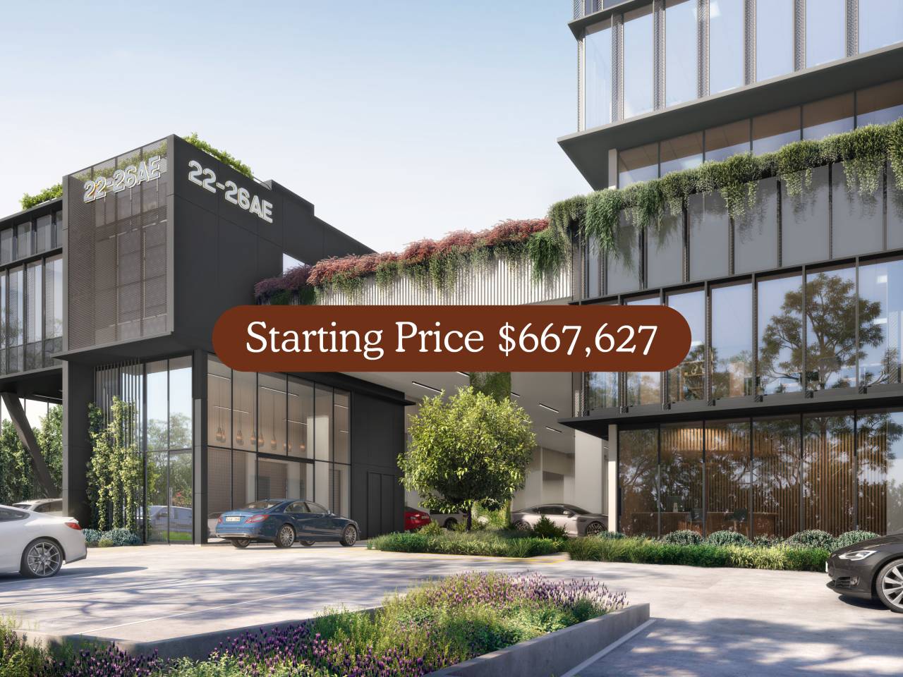These architecturally designed units feature warehouse clearances up to 7.0 m* and office ceiling heights up to 3.0 m*, complemented by on-site EV charging and premium finishes throughout. The tiered building form, natural materials and extensive landscaping maximise site efficiency without compromising access or usability - delivering a modern, functional and visually striking workspace.